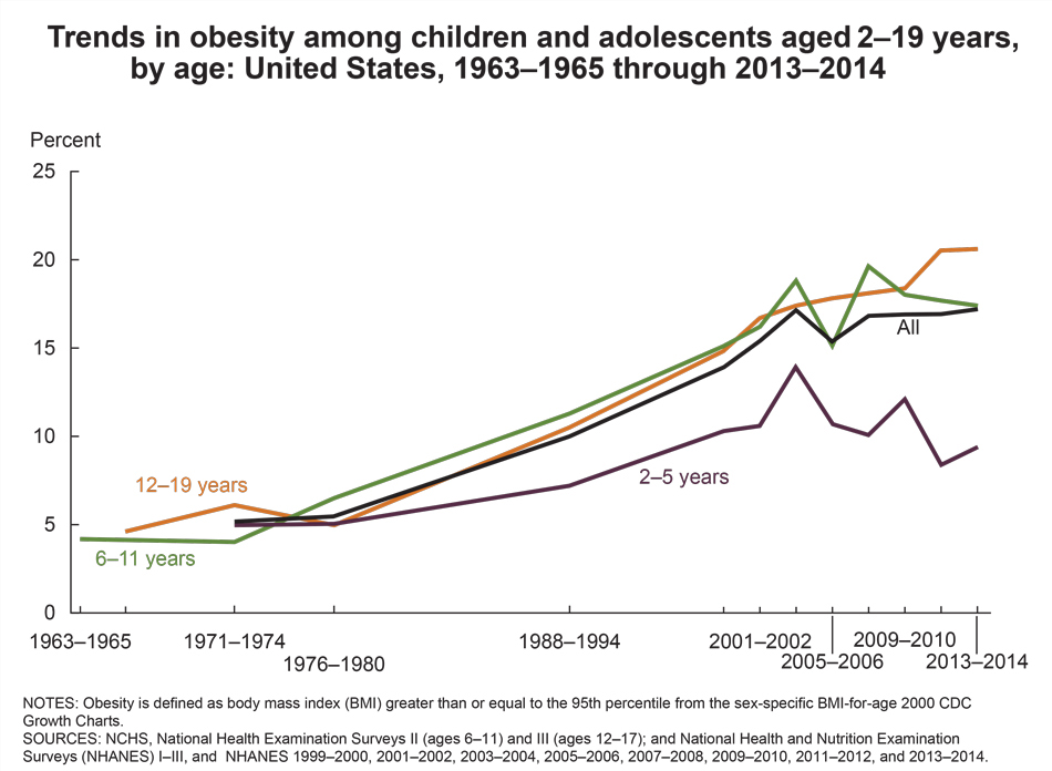 The prevalence of obesity among children and adolescents 2 to 19 years increased between 1988-1994 and 2003-2004. Since this time there has been no significant change in prevalence.
